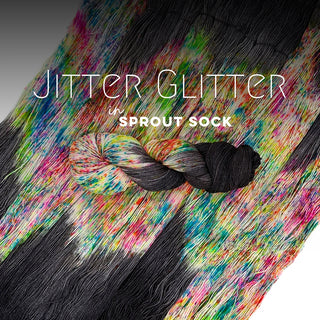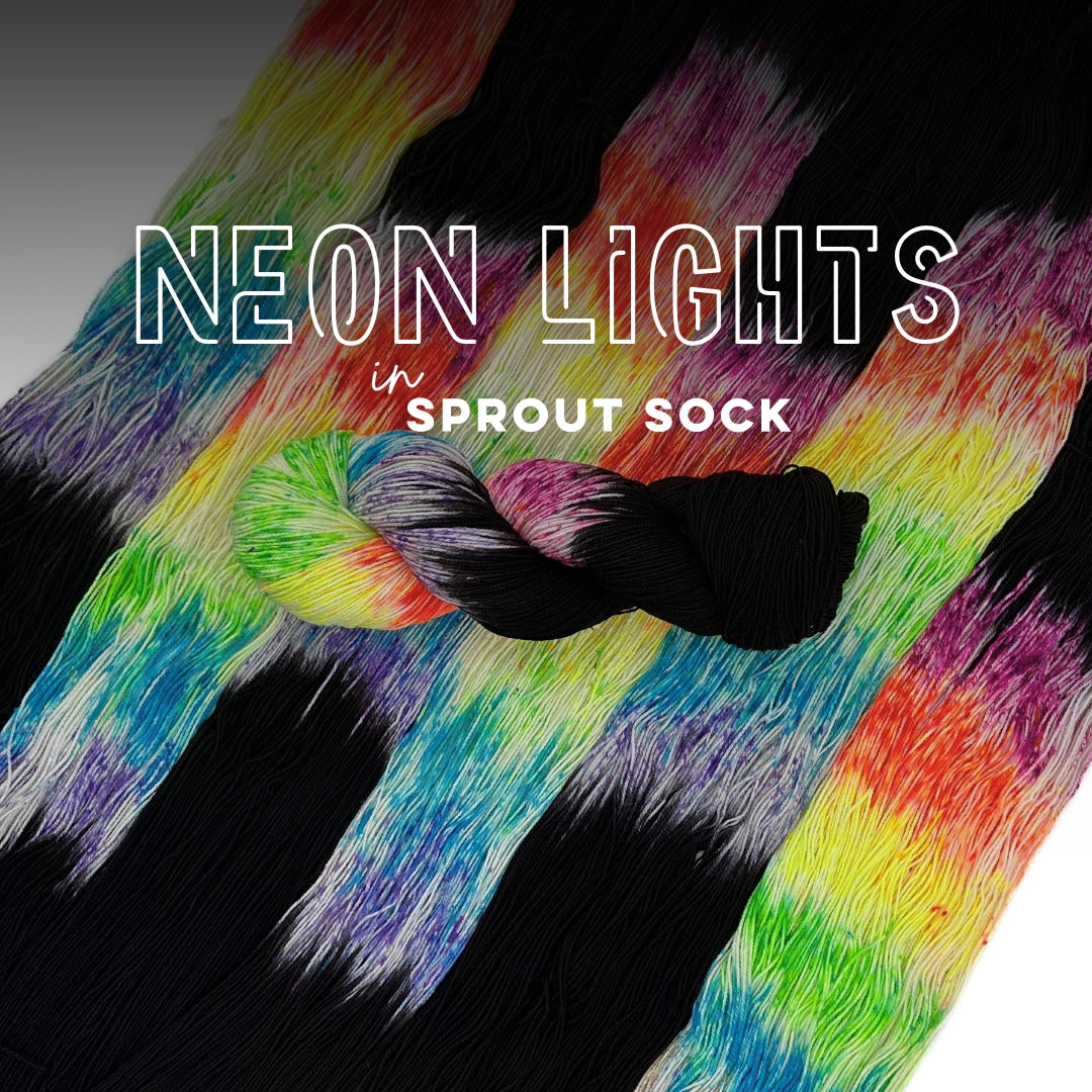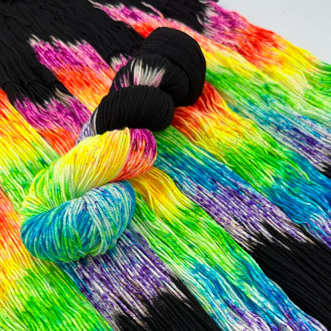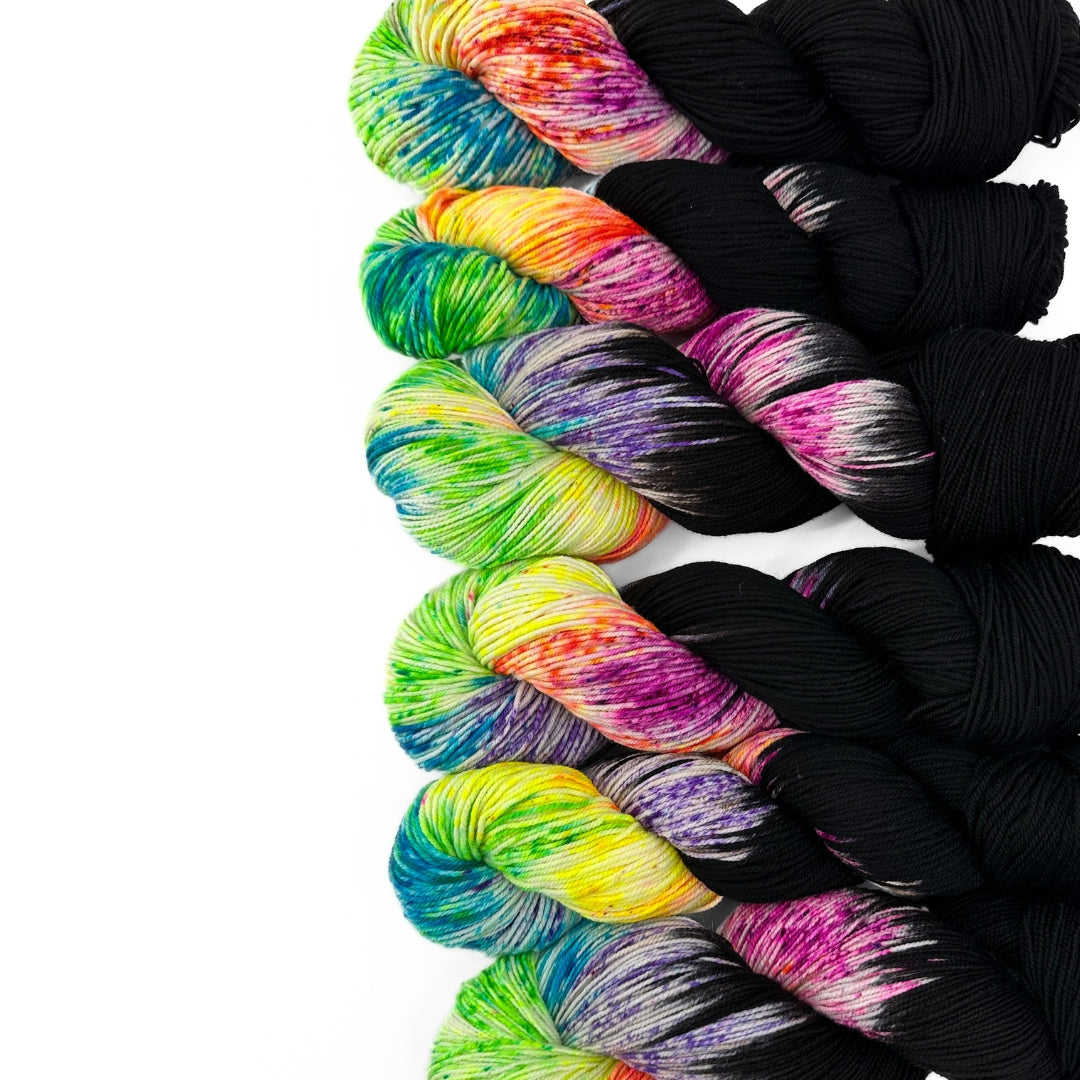 A Half-Speckled, half tonal-solid. Half in black (Noir) paired with a natural background, covered with neon flecks of pink, orange, yellow, green, aqua, and purple. Dyed on our Sprout base in the Sock/Fingering weight.