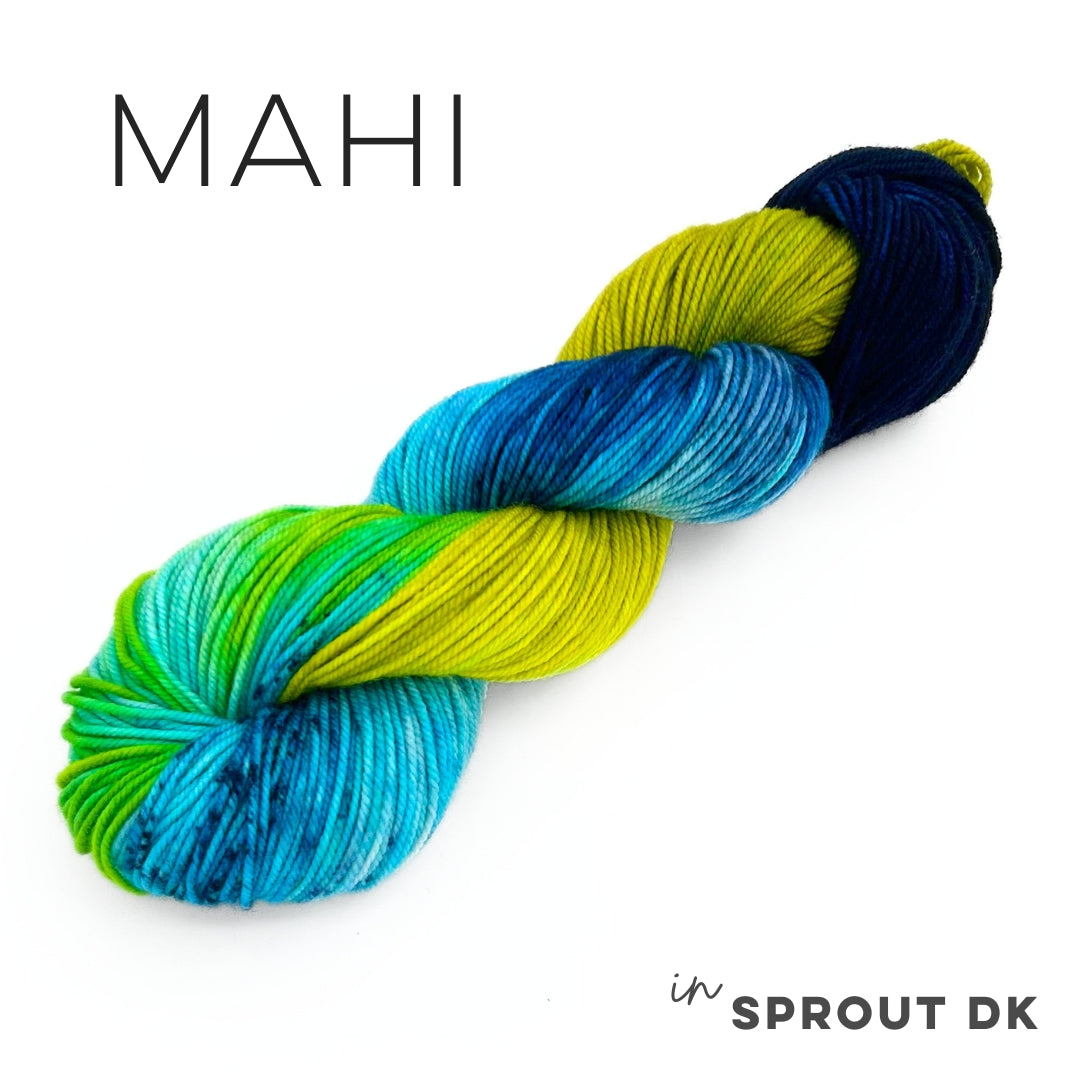 A Dipped that's starts in a Toxic yellow green, goes to an aqua, and then deep navy blue, speckled with dark blue. Dyed on our Sprout base in DK weight.