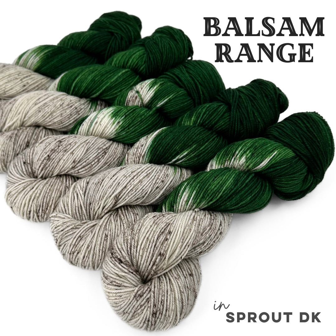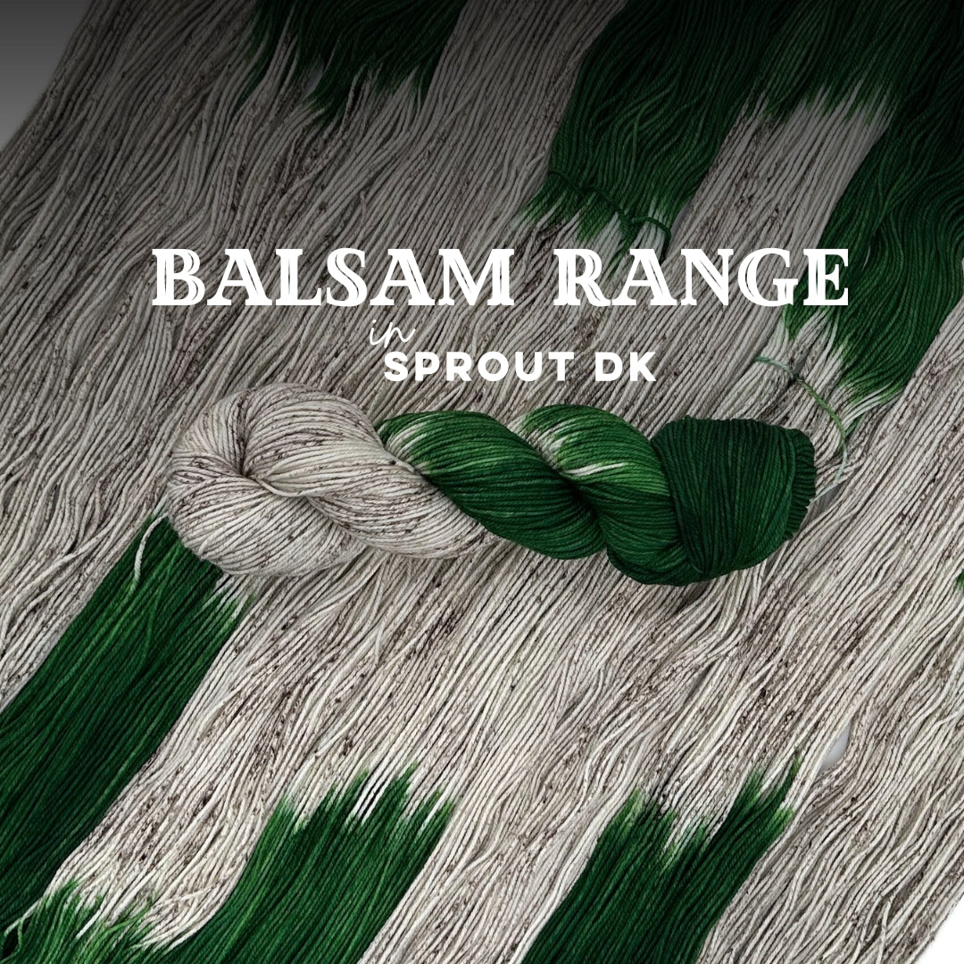 A Half-Speckled, half tonal-solid. Half in a rich, slightly yellow-toned green (Forest) paired with a pale brown (Birch) covered with flecks of pewter. Dyed on our Sprout base in the DK weight.