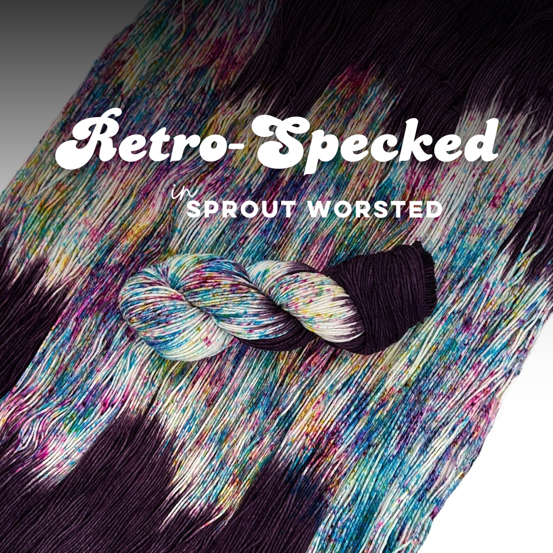 A Half-Speckled, half tonal-solid. Half covered in a rich purple (Plum), half a natural background speckled with aquas, yellows, and pinks. Dyed on our Sprout base in the Worsted weight.